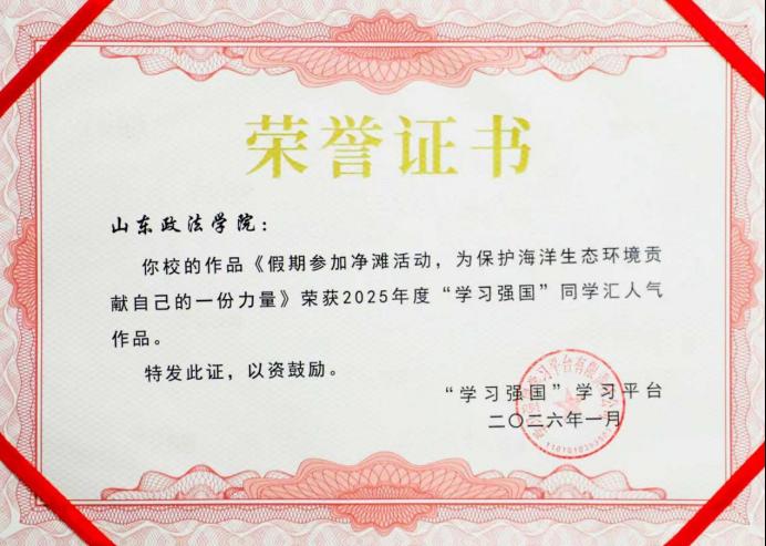 近日,中宣部宣传舆情研究中心、“学习强国”学习平台公布了 2025年度同学汇获奖情况,我院2022级财务管理专业学生党员王奕璠的新闻作品《假期参加净滩活动,为保护海洋生态环境贡献自己的一份力量》从全国410所参评高校的6万余件参赛作品中脱颖而出,入选“2025年度人气作品”。
